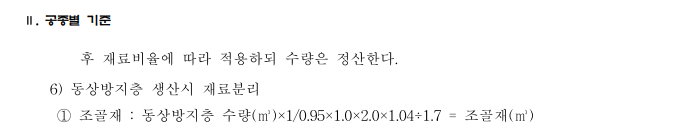 조골재의 경우, 조골재 단위 중량이 1.7, 재료할증율이 4%, 혼합골재중 조골재가 차지하는 비율이 95%